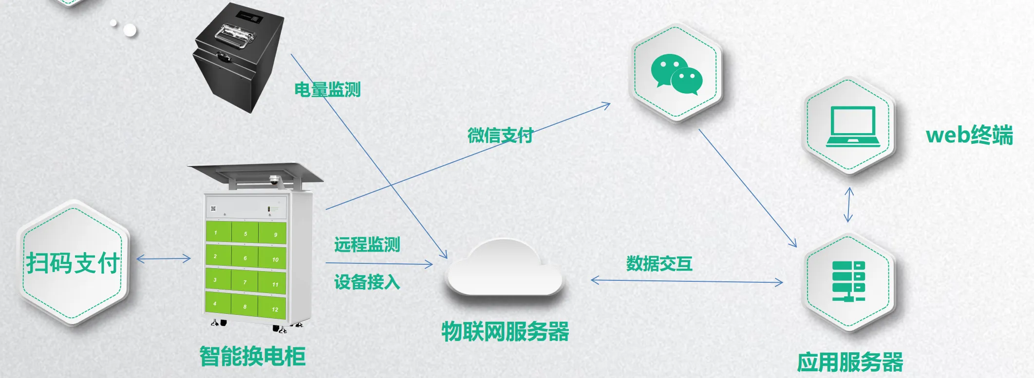 2. 网络管理系统:实现设备的远程监控和管理,包括电池状态、充电记录等数据的收集和分析,同时提供用户注册、充值、换电等服务。